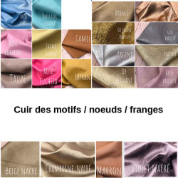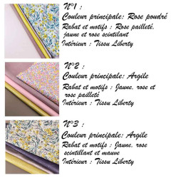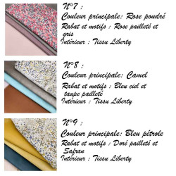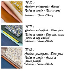 Choisissez l'association de couleurs désirée pour le cuir (couleur principale, rabats et motifs) et l'intérieur en tissu liberty en fonction du nuancier.
