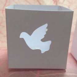 Ajourées du dessin de votre choix (découpe avec un grand oiseau, des petits oiseaux, des papillons ou une colombe), elles se referment par un tissu à carreaux bleus et blancs noué par un ruban assorti.