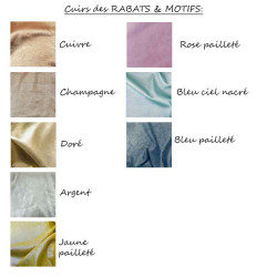 - La couleur du cuir du rabat (languette) et la couleur du nuage du haut du carnet parmi les couleurs du nuancier des cuirs des rabats et motifs (en photo),