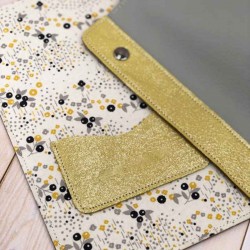 Cette housse pour carnet de santé est fabriquée de façon artisanale (qualité fait-main) en France. Elle est entièrement en cuir pleine fleur. Le rabat est doublé de tissu liberty, renforcé avec un rangement pour la carte vitale.
